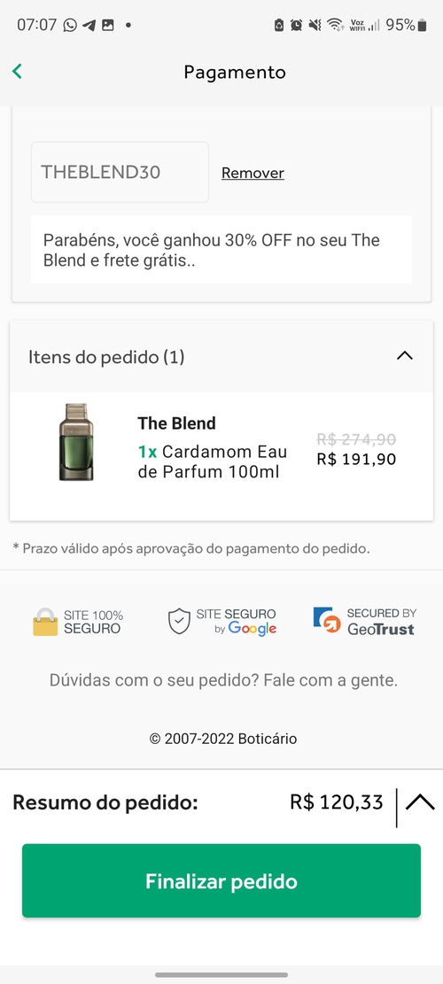 O valor de R$ 134,33 só é atingido no APP Boticário (preço no app: R$ 191,90) e aplicando-se o cupom THEBLEND30 no carrinho (30% de desconto - R$ 57,57).