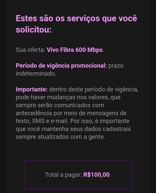 Minha mãe assinou essa promoção no nome dela, sendo que ela já tem uma instalação da Vivo Fibra e ia cancelar a atual pra pegar a promoção.