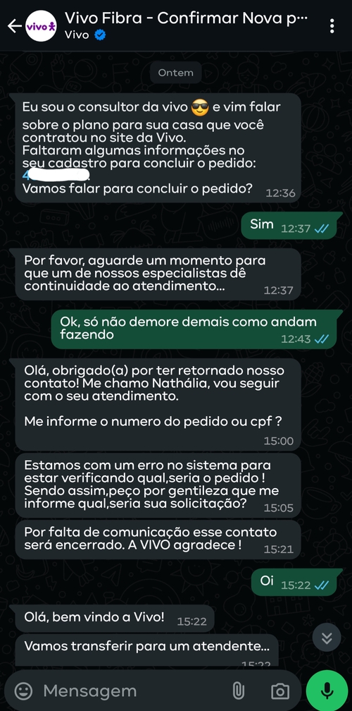 Enfim, eu não entendo como funciona a Vivo. Mas só consigo algo com eles quando alguma atendente parece saber o que fazer. Na maioria das vezes abro reclamação na Anatel e espero eles virem atrás de mim, ao invés de perder um tempão com eles.