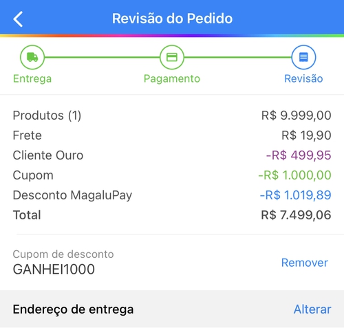 Galera consegui agora a pouco, usei o cupom e não estava permitindo pager no cartão com o valo4 de 7600, quando botava opção do cartão subia para 8330,00 daí liguei no Magalu, conversei com o vendedor, Madei o Print com a questão de está aparecendo o preço de 7600 a vista e de mudar valor para pagar no cartão. Demorou , falou com o gerente daí, me passou que seria possível via pix ou boleto. Me encaminhou os dados para o pix via WhatsApp, e depois de conferir que o pedido tinha sido feito no aplicativo com o valor de 7600, fiz o pix , quase que de imediato o pedido foi aprovado e deu tudo, boa sorte aí!!