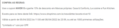 Válido a partir 05/04/2022 às 08:00 até 08/04/2022 às 23:59, ou até as 1000 primeiras utilizações. *Limitado a 1 uso por CPF.