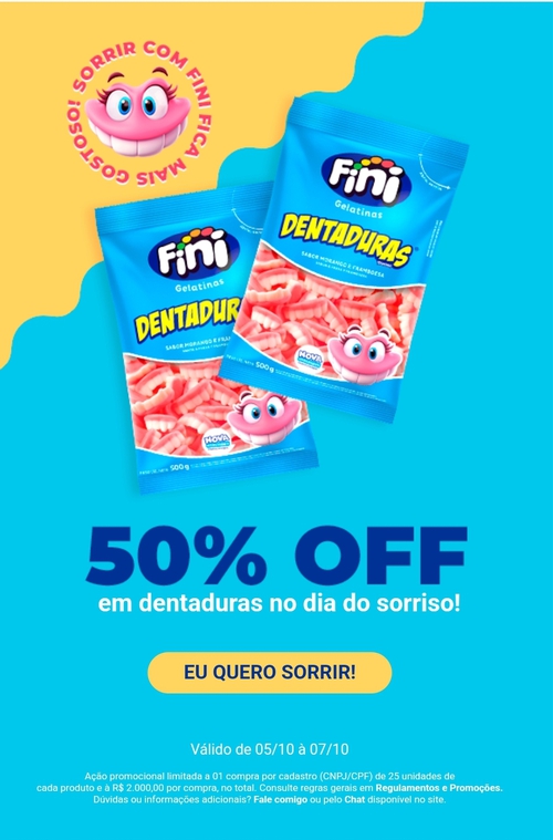Aproveite 50% OFF em dentaduras no site Fini Store