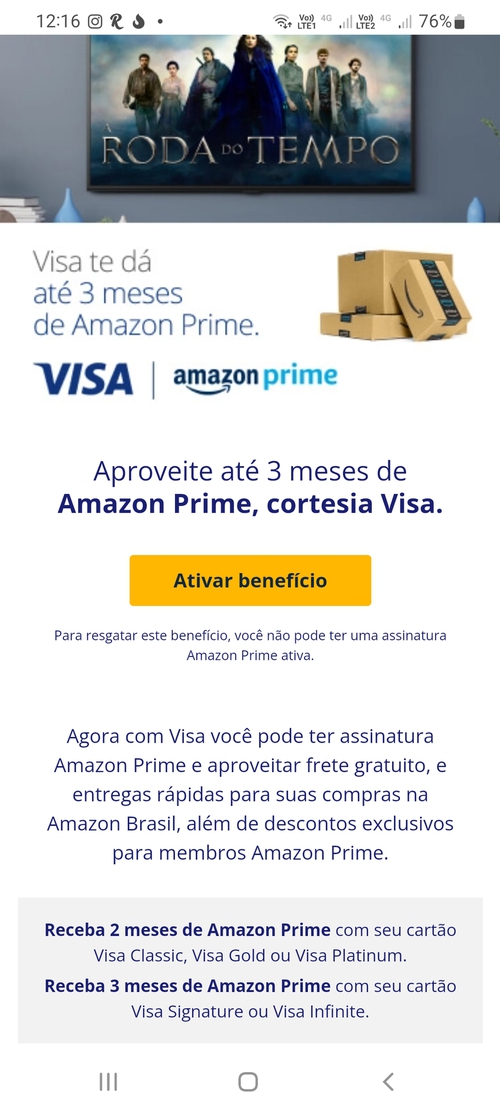 Aproveite até 3 meses de Amazon Prime, cortesia Visa.