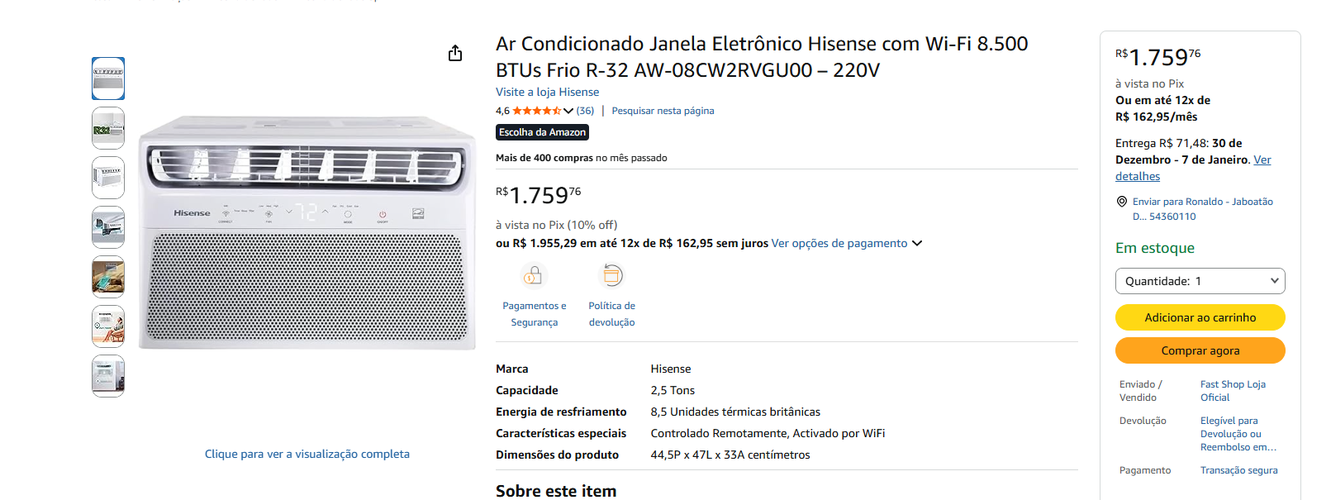 Peguei, esse Hisense é um dos melhores ar-condicinado janela do mercado, além de silencioso "não tô falando que não faz barulho, faz sim, mas é bem melhor do que outras marcas", ele tem controle e ainda wi-fi!!! Muito bom mesmo, e deu 84 reais de frete para Joinville/SC. Obrigado, o meu abrigo de 7500btu gelava bem, esse novo agora com 8500 vai ser top!!! Ah e é muito econômico comparado com outras marcas.