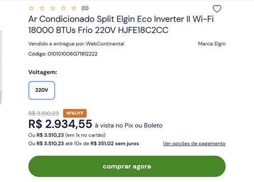 Ar Condicionado Split Elgin Eco Inverter II Wi-Fi 18000 BTUs Frio 220V HJFE18C2CC