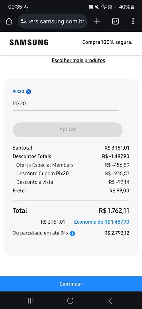 Alguém saberia me orientar como consigo aplicar esse desconto? No meu carrinho só aparece como "Desconto especial Samsung.com " não aparece o desconto como "Desconto Samsung members". Eu criei a conta no aplicativo da samsung shop, e loguei na minha conta. Como faço pra ser considerado "members" na hora de aplicar o cupom? Quem puder ajuda por favor. Aqui tá saindo 2500 e não 1878 :( .