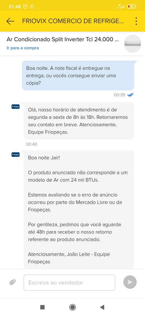 Também irei à justiça se preciso for pois, o anúncio continua lá no ML. E agora tem anúncio de um Britânia 24000 btu por 1615,00. To printando todos os posts de sites de ofertas e do ML.