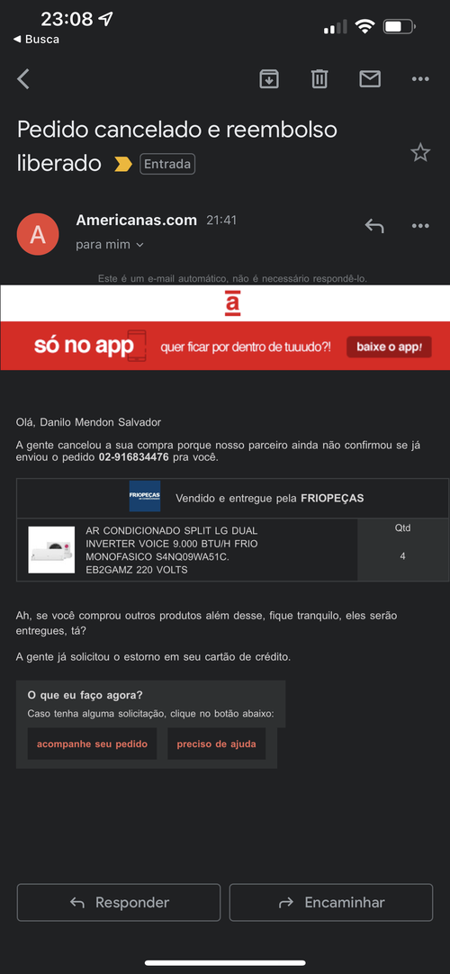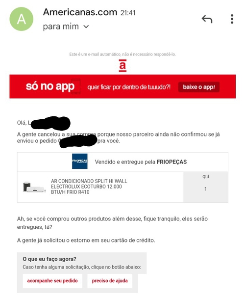 A americanas vai mandar um e-mail nos próximos dias, pra eu comprar o ar da frio peças pelo mesmo valor que eu tinha comprado antes.