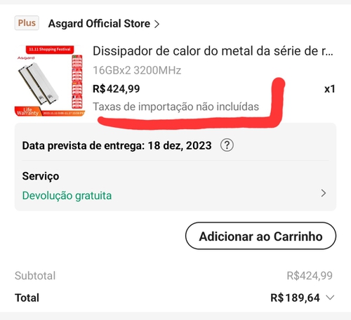 adicionem os cupons ASGARD1534 e 11SC4 pra chegar no valor de 189 já com impostos pro kit de 32gb