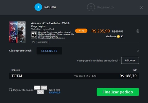 Assassin's Creed Valhalla + Watch Dogs Legion | R$ 189