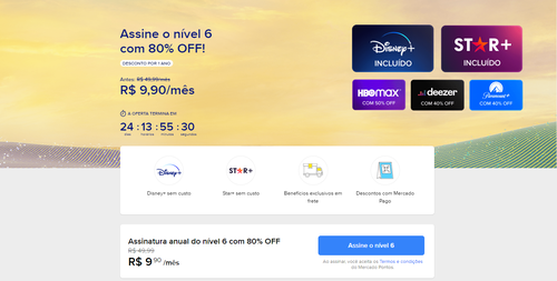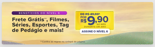 *Promoção do Nível 6 Mercado Livre válida de 07/03/2022 até 31/03/2022 às 23h59 para novos assinantes do nível 6 pelo valor de R$9,90 ao mês durante um ano.