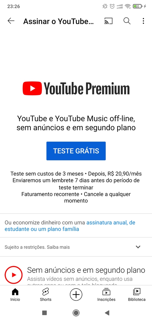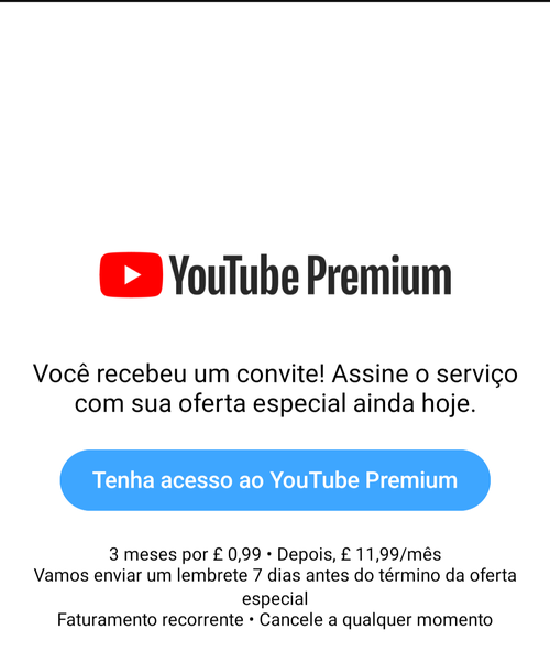 Assinatura do YouTube Premium de 3 meses por 1,99
