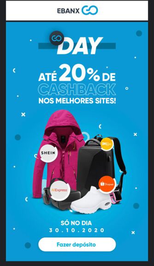 Até 20% de cashback em parceiros EBANX GO (Shein, Aliexpress, Shopee)