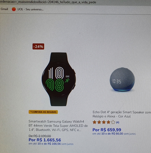 Tenho dúvidas se essa Alexa está realmente na promoção do cashback... eu tô muito afim de comprar, porém se acessarem casasbahia.com.br/l/tudoqueavidapede...slot5 pra ver as regras da promo, e entrar na categoria "acessórios e inovações" vão ver que lá tem uma Echo dot 4 com relógio, mas custando R$659,99. Essa da promoção não se encontra por meio desse link... fiquem espertos amigos!