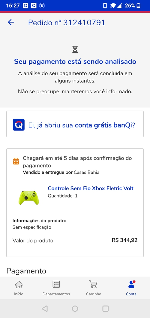 Eu realizei compra pelo celular, mas no Site mesmo das casas Bahia, cliquei lá pagar com banqi ele abriu o aplicativo e usou o saldo que estava lá, foi ontem e até agora não chegou notificação, será que deu ruim ? Melhor cancelar e fazer de novo ?