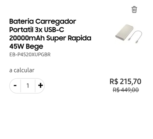 Tenho um da Essager 20000mAh 65w e consegue dá três carga de 0 a 100% num celular de 4500mAh e sobra só uns 7% de carga no Powerbank será que esse da Samsung sobra mais