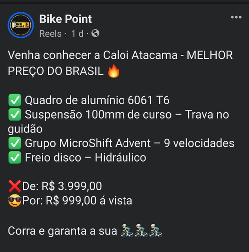 Preço excelente! O site da bike point tá fazendo há alguns meses uma grande queima de estoque dos modelos 2021/2022, quem tá procurando por bike de todos os níveis esse é o momento ideal, recomendo seguirem a página no Instagram pois diariamente eles estão postando "promoções relâmpagos" que geralmente duram 24h.