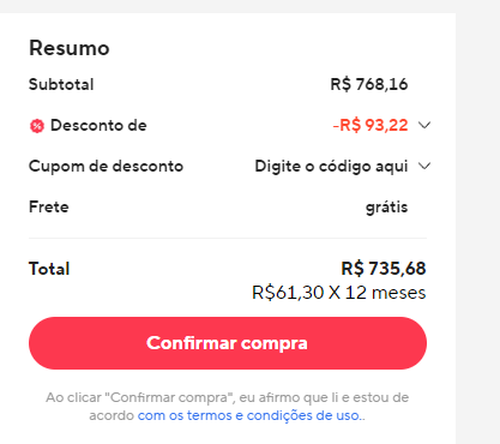 Aqui dá o desconto más n altera o valor no final fica 763, no app e no site