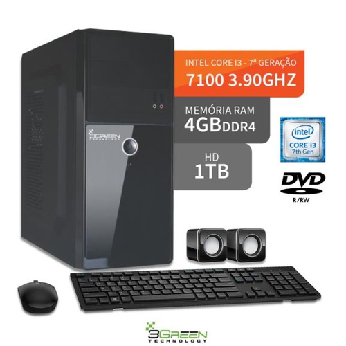 Com o potente processador Intel Core i3 de 7 geração Kaby Lake 7100, saída de vídeo com suporte a 4K, memória DDR4 e Rede Gigabit, o seu computador 3Green Evolution está apto a desempenhar multitarefas com altíssima fluidez. Pontos fortes do produto:1- 3.9Ghz de frequência com 3MB de cache 2- Conexões USB 3.0 e rede Gigabit de alta velocidade3- Saída de vídeo HDMI com suporte a 4k e resolução máxima de 4096x23044- Saída de áudio de 5.1 canais de alta definição5- Placa de rede Gigabit 10/100/1000Sistema Operacional completo com licença vitalícia e super pacote de programas e aplicativos já instalados:Produtividade e escritórioEditor de textoEdição e editoração de textos com dicionário de correção automática. Corrija erros na ortografia e gramática, além de pleonasmo, arcaísmo, gerundismo, etc.PlanilhasTorne-se um especialista em planilhas, utilizando modelos com funções internas, de modo que você possa voltar a usar uma planilha preconcebida e se concentrar apenas no trabalho imediato.Editor e criador de apresentações e slidesAdicione estilo e ofisticação a sua apresentação, traga vida a sua com animações e efeitos 2D e 3D.Desenho técnico e fluxogramasUm excelente programa para a produção de desenhos técnicos, pôsteres , etc. Construa fluxogramas e organogramas mesmo que você não seja um artista naturalmente talentoso.Criador de gráficosCrie facilmente gráficos de pizza, colunas quadradas e redondas, gráficos de tendências, pontos, gráficos 2D e 3D etc.Editor de equações e fórmulasEle pode ser chamado em seu documento de texto, planilha, apresentações e desenhos, para que você insira fórmulas matemáticas e científicas perfeitamente formatadas. Seja frações, termos com expoentes, integrais, matrizes, etc.Gerenciador de banco de dadosOferece mecanismos de suporte nativo para os banco de dados multiusuário mais amplamente utilizados: MySQL/MariaDB, Adabas D, MS Access, Firebird e PostgreSQL.Comunicação e Redes sociaisInstagramUma forma simples, divertida e criativa de c