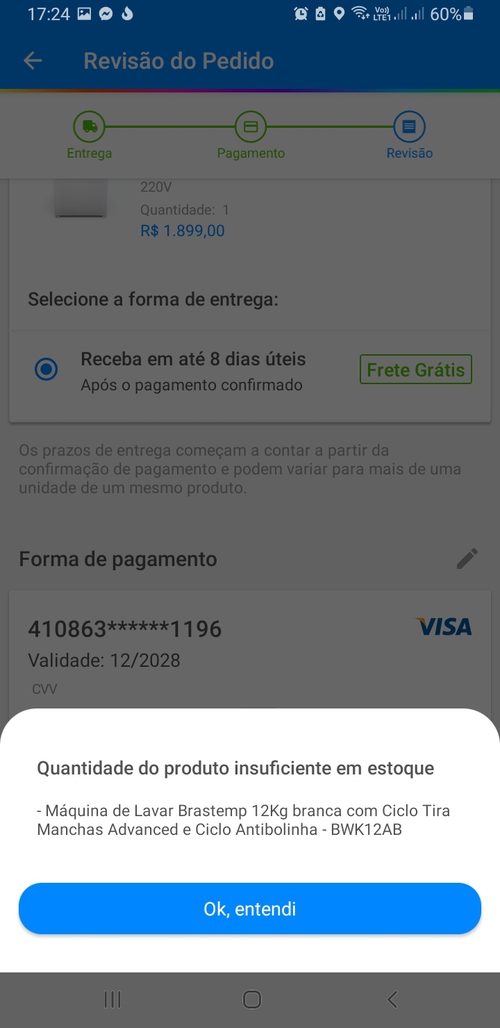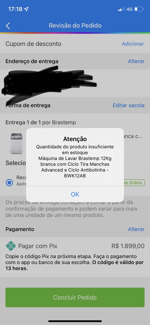 Liguei para o Magalu. Falaram que pediram um retorno da Brastemp sobre honrarem ou não o pedido. Falaram para esperar por 48 horas para o posicionamento.