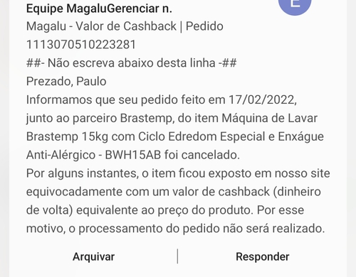 Só para avisar, não é só esse produto, a maioria dos produtos da Brastemp está com o bug do cashback