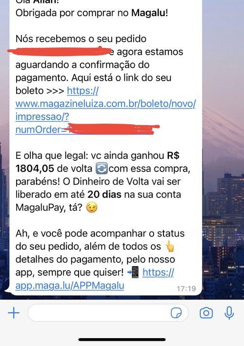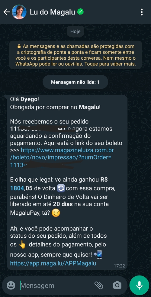 Gente, para quem colocou boleto, vocês receberam algo da Magalu? Sempre que compro por lá mandam um WhatsApp (até quando já comprei em boleto) e dessa vez nadaaaa