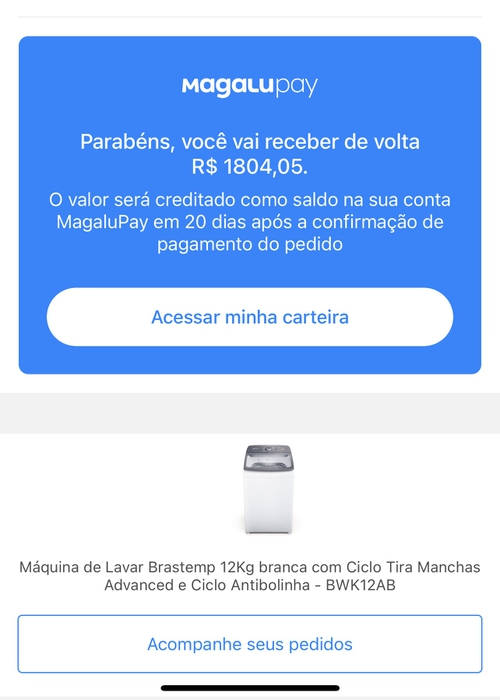 Alguém tem o print completo da lavadora? Se puder me envia inbox! Procon disse que dá pra ganhar e o cash back entra como brinde. Até pq a Magazine condicionou forma de pagamento pra receber o cash back.