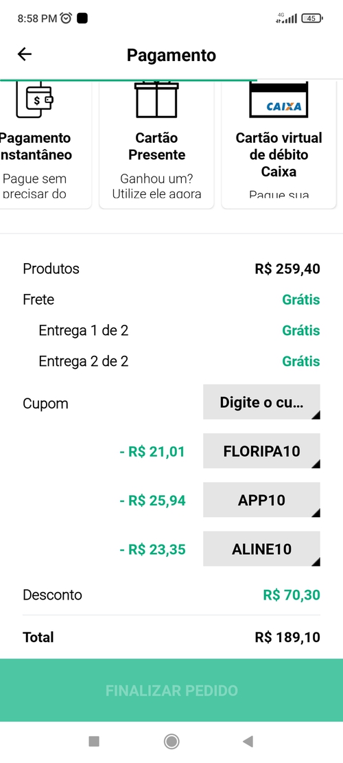 Aqui quando coloco o cartao ele tira o cupom PRESENTERENNER2021