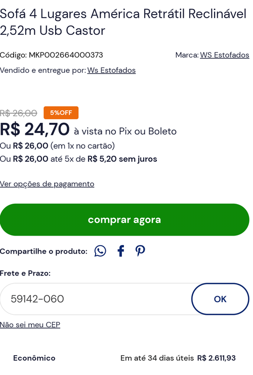 brasileiro e bobo mesmo, por isso sofre golpe, acham que a loja é cega e nao vai percebem inumeros pedidos e notas fiscais com um sofa de mais de 2 mil reais com preço de um hot dog, a pelo amor depois ficam indo no reclameaqui perturbar