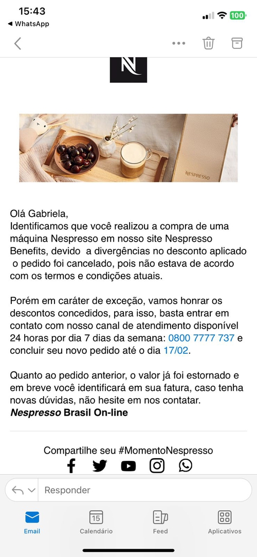 Eu contestei falando q não tinha recebido nenhum email cancelando e que não concordava ainda mais que a NF ja tinha sido emitida. E tinha outras pessoas q tinham recebido.