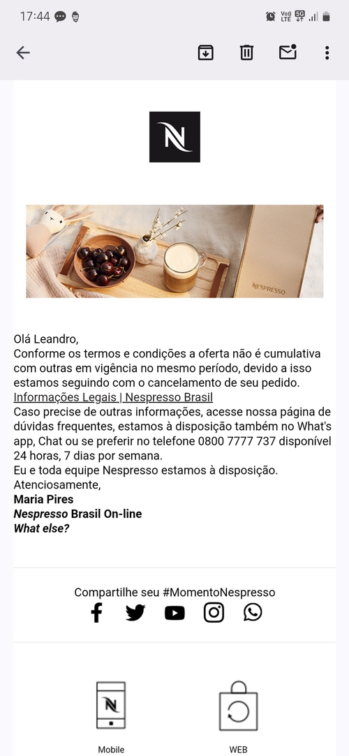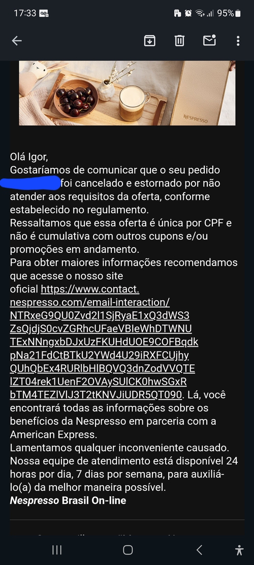 Se alguém resolver postar a NF, vou compartilhar toda a informação Consumidor>Procon>Justiça, inclusive as provas que estou usando pra demonstrar a má fé da Nespresso em não cumprir a oferta que fizeram.