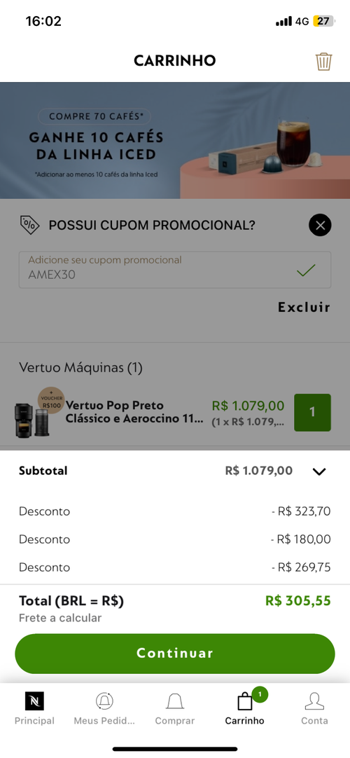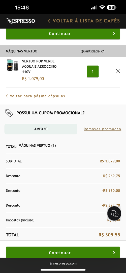 Necessário incluir o cupom AMEX30 para chegar no valor