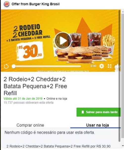 Burger King: 2 Rodeio+ 2 Cheddar+2 batata pequena+ 2 refill - R$ 31