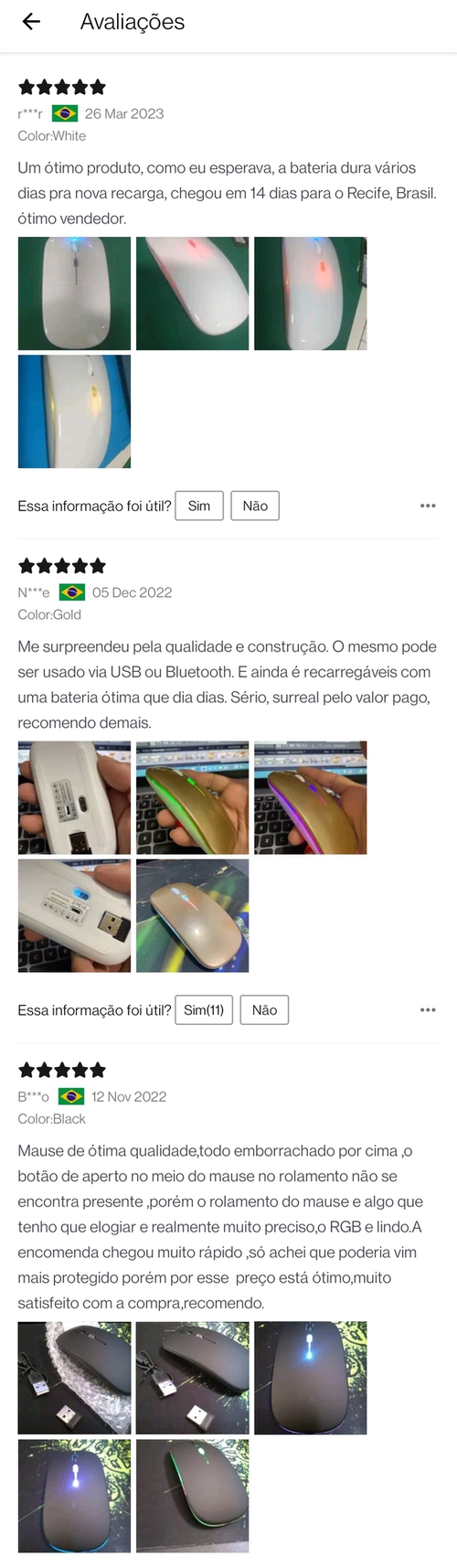 Muito bom esse mouse e comprei pela shoppee mês passado eu fiquei em dúvida mas quando chegou eu adorei muito bom mesmo muito silencioso e muito bom funciona muito bem troca de cor mas também você pode deixar desligar essa função para durar a bateria sei lá mas ainda não descarregou para mim é muito bom ele eu comprei o branco