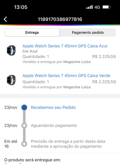 No magalupay, sai 2330. Entrar pelo app e pesquisar por Apple Watch… tem branco, azul, verde e vermelho