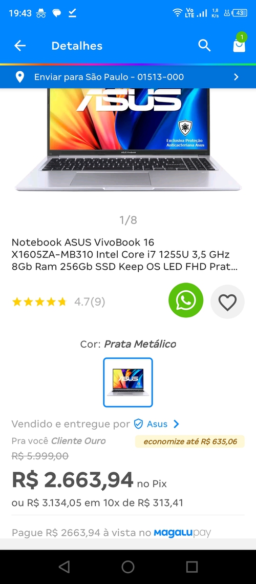 (C.OURO) Notebook ASUS VivoBook 16 i7 1255U 8Gb 256Gb 16 IPS LINUX