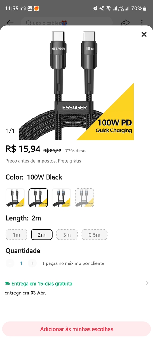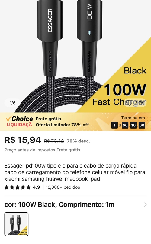 Acabei de pegar esse mesmo cabo esseger 100w 2metros por 8,99 (na promoção de 3 itens). Estou comprando várias coisas em várias contas diferentes pois conta antiga tá rolando esse preço de 8,99 em vez de 15,99. Tô fazendo a festa aqui kkk sou da época das promoções de 0,06 centavos do Aliexpress... É 9 conto mas são coisas até boas