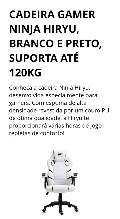 Cadeira Gamer Ninja Kage, Preto e Branco