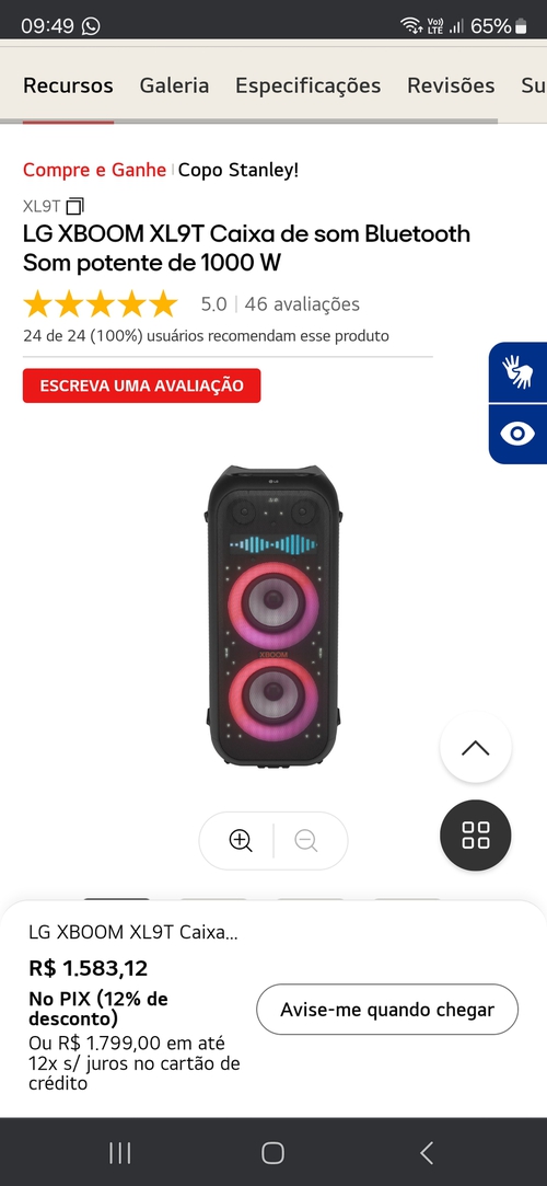 Caixa de som Bluetooth portátil LG XBOOM Go XG9S — IP67 e 24 horas de bateria