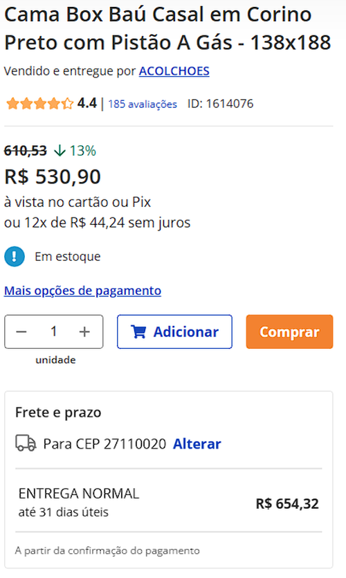 O Box Baú AColchões Preto com Pistão tem um sistema de fácil abertura por pistões a Gás (amortecedores). Proporciona para o seu quarto melhor aproveitamento de espaço, pois seu amplo Baú interno é ideal para guardar objetos, roupas de cama, travesseiros , edredons , etc.... - Base com estrutura produzida em madeira de reflorestamento tratada. - Estrutura: Em madeira - Revestimento: Corino Preto - Tratamento: Antialérgico e Antiácaro - Pistão a Gás: (Maior durabilidade e maior facilidade no manuseio) - Contém 02 puxadores, para maior facilidade na abertura. - Contém 01 Arco na parte de trás para o Colchão não escorregar. - Profundidade Interna 25cm. - Altura do Box 35cm. - Altura dos Pés 6cm. - Altura total com os pés: 40cm Garantia: 03 Meses (Garantia Legal) Não Acompanha o Colchão. Foto meramente ilustrativa. Importante: - Verifique se o local de entrega está apto a receber o produto com as dimensões informadas. - Não nos responsabilizamos em subir pelas escadas ou içar o produto. - Não nos responsabilizamos pela montagem ou instalação do produto. Características do produto Aviso Montagens, desmontagens e instalações são responsabilidades do cliente. Estes serviços não estão inclusos no valor do produto. Para evitar imprevistos na sua entrega, confira as dimensões do produto no momento da compra e certifique-se de que ele passará por elevadores, portas, escadas e corredores. Imagens meramente ilustrativas. Dimensões aproximadas do produto 138x188cm Modelo Cama Box Baú Material (MDF, MDP) Madeira Garantia 3 meses Tamanho Casal Modelo Casal Dimensões do produto: Largura: 1,38 m Altura: 35,00cm Profundidade: 1,88 m Peso: 50 kg