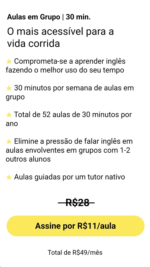 Open English tá com plano de 10 aulas particulares por mes (25min por aula) e aula em grupo ilimitada. Saindo R$245 por mês usando o Vai de Visa. E ainda tão dando uma segunda conta com o msm plano, dividindo sai R$123 pra cada. Tava pensando em pegar, alguém sabe se presta ?