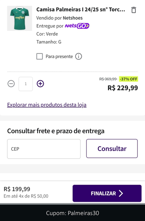 Cupom expira hoje. Tem bastante camisa do Palmeiras em promoção lá, rapeize. Tem uma de goleiro que tá saindo 120pila, cor laranja.