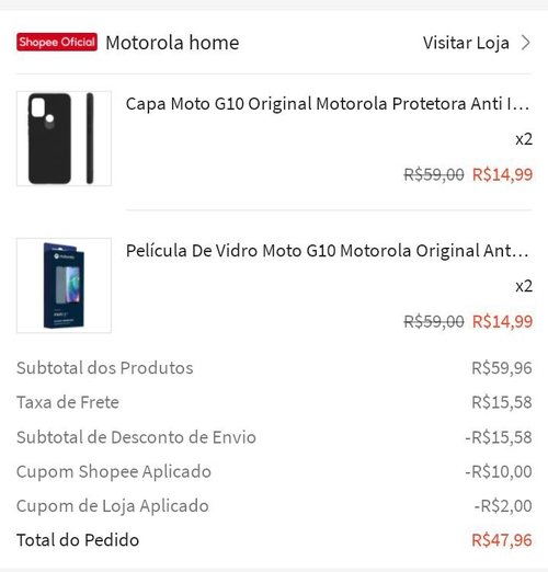Além do cupom de Frete Gratis que pode ser usado para comprar a pelicula e a capinha, também tem um cupom de 10 para compras acima de 50 que poderá ser utilizado no pedido caso compre duas capas e duas peliculas a loja também oferece um cupom de desconto de 2 reais para compras acima de 50 então comprando os 4 itens o valor fica em R$ 47,96 conforme o print abaixo: