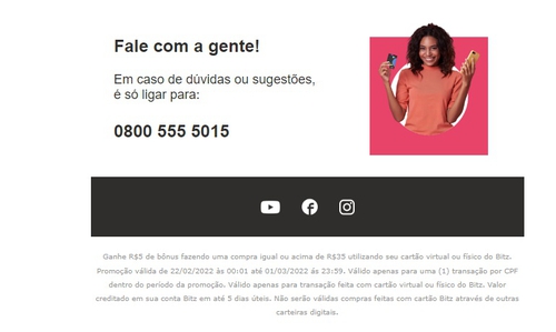 Ganhe R$5 de bônus fazendo uma compra igual ou acima de R$35 utilizando seu cartão virtual ou físico do Bitz. Promoção válida de 22/02/2022 às 00:01 até 01/03/2022 ás 23:59. Válido apenas para uma (1) transação por CPF dentro do período da promoção. Válido apenas para transação feita com cartão virtual ou físico do Bitz. Valor creditado em sua conta Bitz em até 5 dias úteis. Não serão válidas compras feitas com cartão Bitz através de outras carteiras digitais.