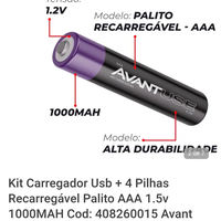 Carregador USB + 4 Pilhas AAA Recarregáveis 1.5V