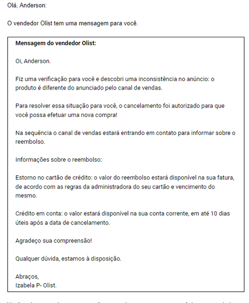 Mensagem do vendedor Olist:Olá,O produto que você adquiriu foi anunciado de forma equivocada. Trata-se de erro grosseiro e de fácil percepção quanto ao preço do produto, pois o valor não condiz com o preço médio de mercado nem com o custo mínimo.Sentimos muito pelo ocorrido.O cancelamento e ressarcimento dos valores pagos já foram aprovados. Na sequência o canal de vendas estará entrando em contato para informar sobre o reembolso.Agradecemos a sua compreensão!Atenciosamente,Olist