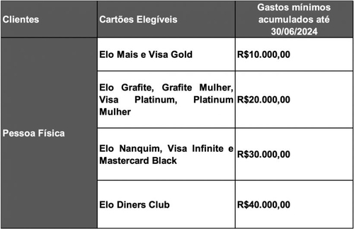 Além do prazo até o final de junho, outro fator que deve facilitar o cumprimento da meta é a regra que estabelece que os gastos dos cartões adicionais gerados também durante o período promocional – 08/01/2024 a 12/01/2024 – serão cumulativos aos gastos do titular para realização do objetivo.