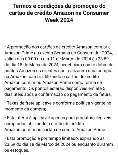 Pontos em dobro que você não pode usar. Faz 4 meses que eu uso, mais de 160 reais em cashback congelado. A única vontagem é parcelar em mais vezes na amazon, pq o resto é história pra boi dormir
