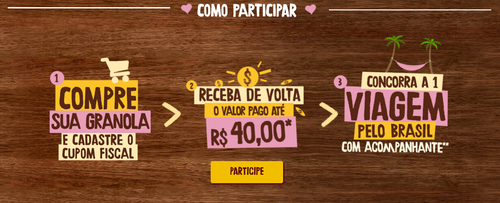 Promoção Sua Granola Tá Paga! A marca está devolvendo até R$40 diretamente para sua conta, ou seja, você compra qualquer produto da marca, se cadastrar e recebe a grana de volta, assim o produto sai de graça para você. Além disso, você ainda concorre a 1 viagem pelo Brasil com acompanhante.