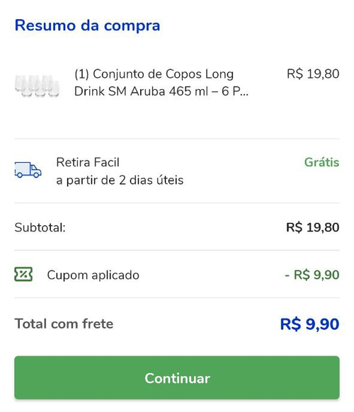 Obrigada não comprei os copos,mas comprei um kit de facas Tramontina, que fazia muito tempo que queria comprar,saiu por 20 reais, retirar na loja 🙏